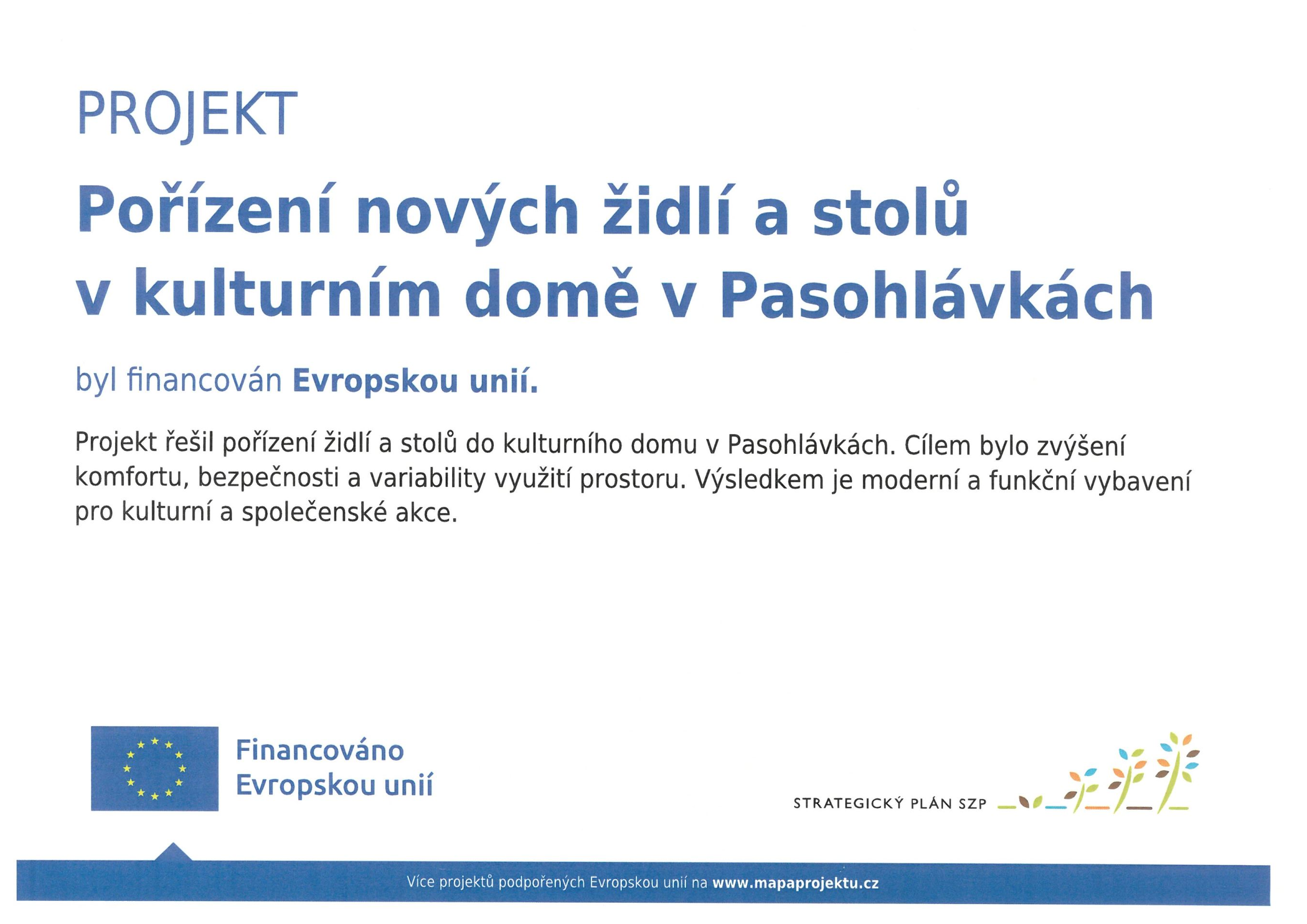Obec Pasohlávky realizovala projekt modernizace nábytku kulturního domu, jehož cílem bylo zlepšení zázemí pro kulturní a společenské akce. V rámci projektu byly pořízené nové židle a stoly, které zvyšují komfort, bezpečnost návštěvníků a umožňují variabilnější uspořádání prostoru. Modernizace přispívá k vyšší atraktivitě kulturního domu a podporuje komunitní život v obci.