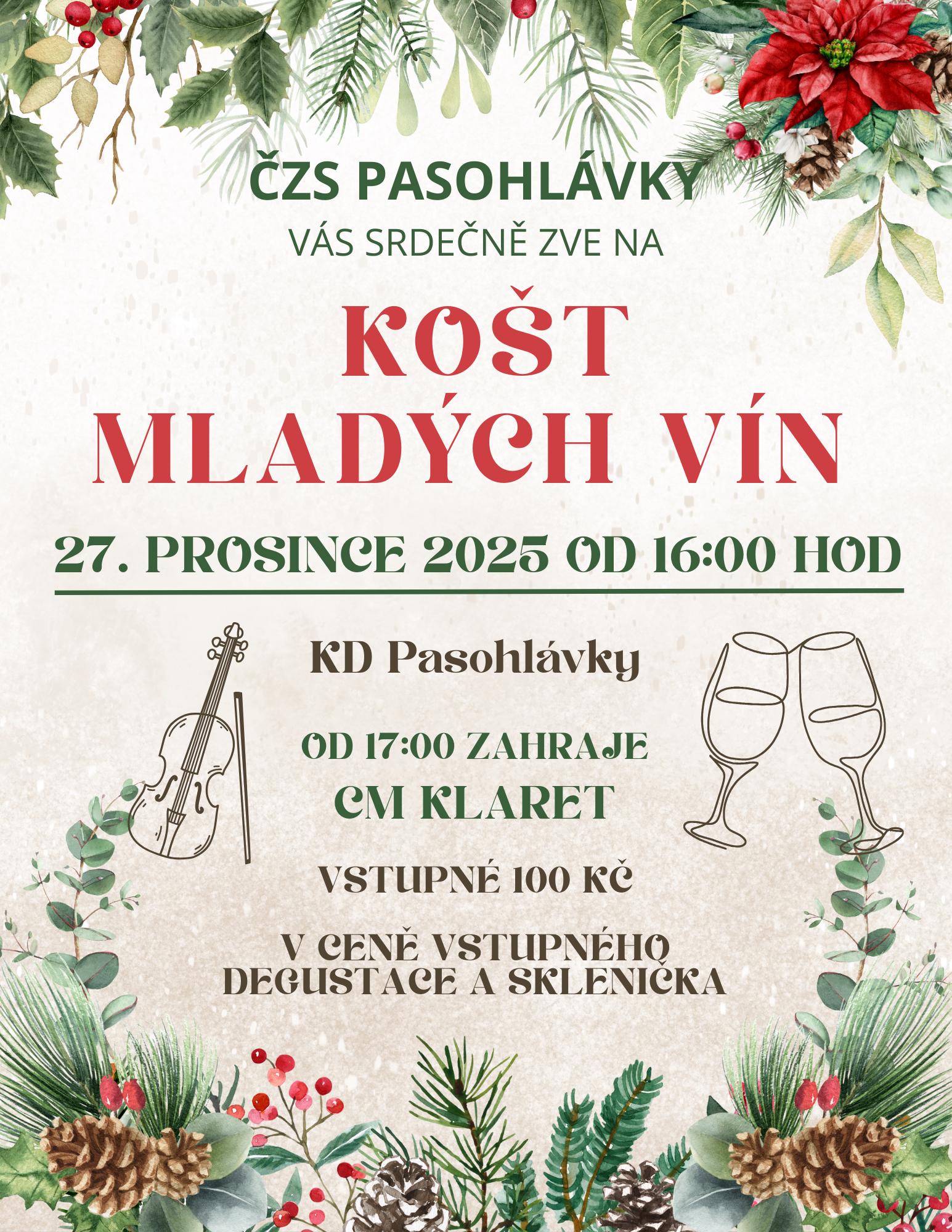 Košt mladých vín 2025 27.12.2025 ČZS Pasohlávky Vás srdečně zve na Košt mladých vín 27. prosince 2025 od 16:00 hodin v KD