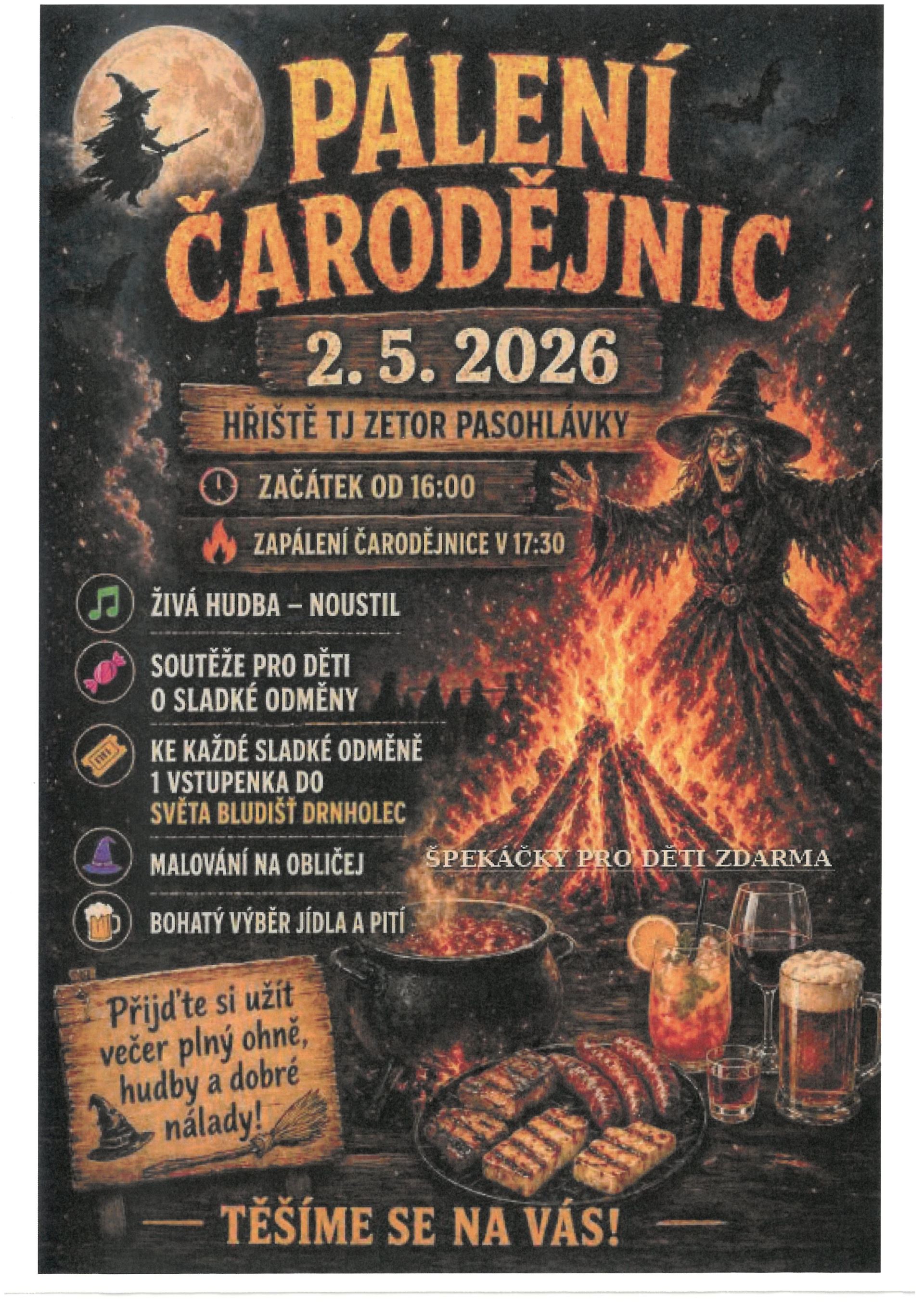 TJ Zetor Pasohlávky ve spolupráci s Obcí Pasohlávky Vás srdečně zve na Tradiční pálení čarodějnic. Těšit se můžete na spoustu zábavy, pohody a bohaté občerstvení.