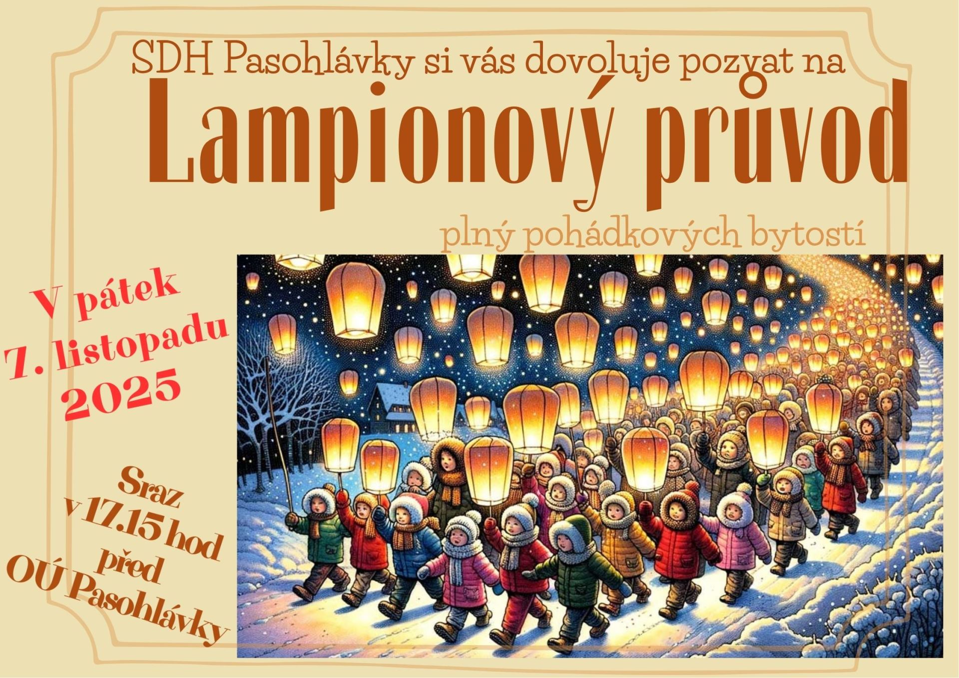 SDH Pasohlávky - Lampionový průvod 07.11.2025 Sbor dobrovolných hasičů Pasohlávky Vás srdečně zve na Lampiónový průvod plný pohádkových bytostí v pátek 7.11.2025 v 17:15 hodin před Obecním úřadem