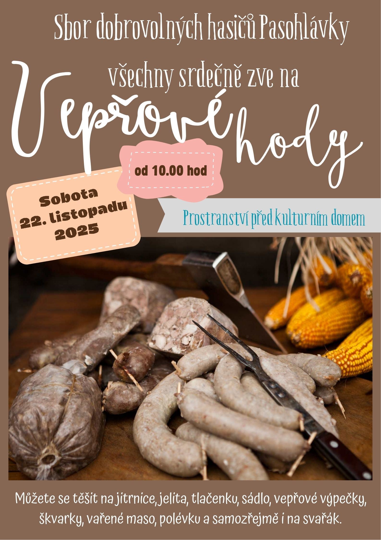 SDH Pasohlávky - Vepřové hody 22.11.2025 22.11.2025 Sbor dobrovolných hasičů Pasohlávky Vás srdečně zve na Vepřové hody v sobotu 22. listopadu 2025 od 10:00 hodin na prostranství před kulturním domem